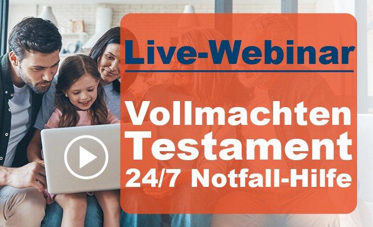In unserem Live-Webinar klären wir über die größten Irrtümer zum Thema Vollmachten, Testament und 24 Std. Notfall-Hilfe auf. Zudem erfahren Sie, wie Sie sich und Ihre Familie durch dauerhafte persönliche Begleitung nachhaltig absichern können. Ihre persönlichen Fragen dürfen Sie nach dem Webinar direkt an den Experten stellen.