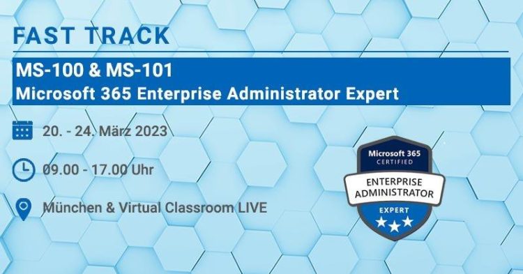 Der Kurs MS-100 & 101 vermittelt Ihnen Kenntnisse, wie Sie Microsoft 365 Enterprise Dienste auswerten, planen, migrieren, bereitstellen und verwalten. Die Zertifizierung zum „Microsoft Certified Enterprise Expert“ können Sie nach dem Kurs im Pearson VUE Testcenter oder Online absolvieren. Eventdatum: 20.03.23 – 24.03.23 Eventort: Online Firmenkontakt und Herausgeber der Eventbeschreibung: CBT Training & Consulting GmbHElektrastraße…Continue reading Unser Fast Track bereitet Sie auf die Zertifizierung vor! (Schulung | Online)