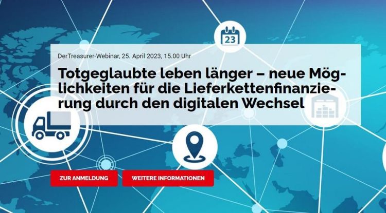 DerTreasurer-Webinar: Totgeglaubte leben länger – neue Möglichkeiten für die Lieferkettenfinanzierung durch den digitalen Wechsel Die „Erfindung“ des Wechsels im Mittelalter war die Grundlage für Handel über lange Distanzen. Bis in die späten 1980er Jahre genoss der Wechsel eine hohe Bedeutung für die deutsche Wirtschaft. In den vergangenen Jahren ist er gerade in Deutschland in Vergessenheit…Continue reading DerTreasurer-Webinar: Totgeglaubte leben länger (Webinar | Online)