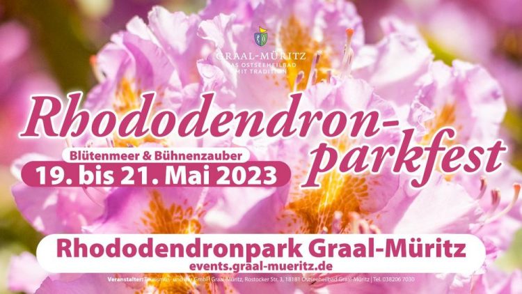 Vom 19. bis 21. Mai 2023 findet das traditionelle Rhododendronparkfest in Graal-Müritz statt. Auf dem Frühlingsmarkt im malerischen 4,5 Hektar großen Park bieten zahlreiche Händlerinnen und Händler ihre Produkte, darunter auch Pflanzen und Gartenaccessoires, zum Verkauf an. Gäste können an vielen Ständen essen und trinken und überdies die einzigartige Blütenpracht der Rhododendronstauden bewundern. Das dreitägige Showprogramm bietet wiederum musikalische Highlights aus den schönsten Zeiten und besten Momenten des Küstenortes sowie weitere besondere Musik- und Kunstdarbietungen. Die amtierende Rhododendronkönigin Annemarie II. lädt des Weiteren zur TUKI-Bahn-Rundfahrt ein. Das bunte Rahmenprogramm des Festwochenendes umfasst Walkacts, Zauberei, Talks, Rundgänge und einiges mehr. Ein ökumenischer Gottesdienst findet am Sonntag statt. Ein weiteres »Highlight«: Zum ersten Mal kann 2023 unter einer modernen Überdachung vor der Hauptbühne gefeiert werden.