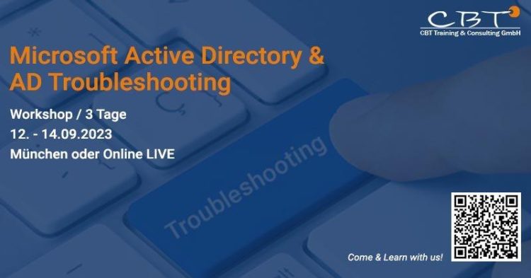 In diesem Workshop lernen Sie die professionelle Fehleranalyse und das Troubleshooting in Active Directory. Eventdatum: 12.09.23 – 14.09.23 Eventort: München Firmenkontakt und Herausgeber der Eventbeschreibung: CBT Training & Consulting GmbHElektrastraße 6a81925 MünchenTelefon: +49 (89) 4576918-12Telefax: +49 (89) 4576918-25http://www.cbt-training.de Weiterführende Links Zum Event Originalinserat von CBT Training & Consulting GmbH Alle Events von CBT Training &…Continue reading Garantietermin: Microsoft Active Directory & AD Troubleshooting (Workshop | München)