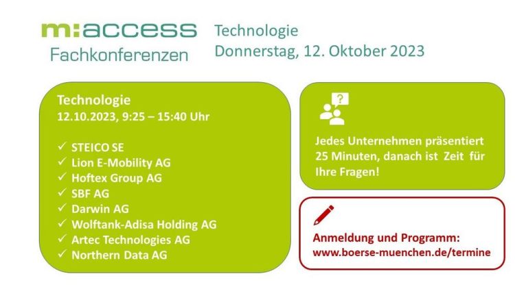 Die Fachkonferenz Technik am Donnerstag, den 12. Oktober 2023, findet als Hybrid-Veranstaltung statt. Die Teilnahme an der Präsenzveranstaltung in den Räumen der Börse München am Karolinenplatz ist für institutionelle Investoren, Analysten und Journalisten möglich. Es präsentieren sich mit der STEICO SE, Lion E-Mobility AG, Hoftex Group AG, SBF AG, Darwin AG, Wolftank-Adisa Holding AG, Artec…Continue reading Fachkonferenz Technologie (Konferenz | Online)