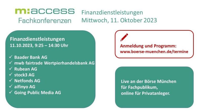 Die Fachkonferenz Finanzdienstleistungen am Mittwoch, den 11. Oktober 2023, findet als Hybrid-Veranstaltung statt. Die Teilnahme an der Präsenzveranstaltung in den Räumen der Börse München am Karolinenplatz ist für institutionelle Investoren, Analysten und Journalisten möglich. Es präsentieren sich mit der Baader Bank AG, die mwb fairtrade Wertpapierhandelsbank AG, die Rubean AG, die stock3 AG, die Netfonds…Continue reading Fachkonferenz Finanzdienstleistungen (Konferenz | Online)