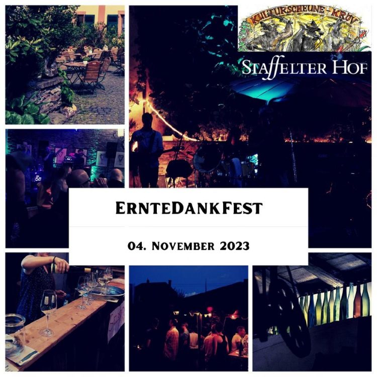 Das Bioweingut Staffelter Hof & die KultUrScheune e.V. feiern diese schöne Weinlese 2023 gebührend mit der legendären ErnteDankFeier! Kommt am 4. November ab 20 Uhr nach Kröv in die beliebte KultUrScheune im Bioweingut Staffelter Hof. Ab 21 Uhr spielt die Vorband The Navesink Banks melodischen Punkrock für euch. Den Hauptact macht später die 90er-Jahre Kult-Rock-Coverband…Continue reading ErnteDankFest – Rockparty in der KultUrScheune des Bioweinguts Staffelter Hof (Unterhaltung / Freizeit | Kröv)