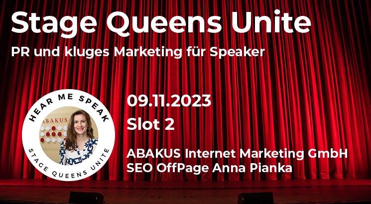 Online-Event „Stage Queens Unite“ vom 7. bis 9. November 2023 mit der ABAKUS Internet Marketing GmbH Vom 7. bis 9. November 2023 findet das Online-Event „Stage Queens Unite: A Women’s Speaking Empowerment Summit“ statt. An drei Tagen können Sie spannende Vorträge rund um das Thema „Mehr Frauen auf der Bühne“ erwarten. Etablierte Speakerinnen geben in…Continue reading Stage Queens Unite: A Women’s Speaking Empowerment Summit (Vortrag | Online)