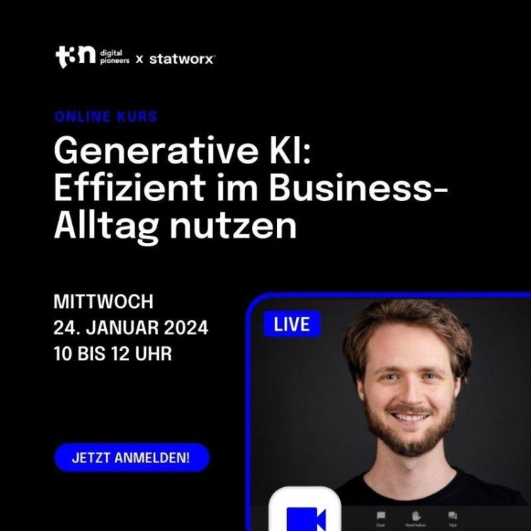 Onlinekurs kompakt Generative KI: Effizient im Business-Alltag nutzen Lerne, wie du generative KI-Tools wie ChatGPT in deine täglichen Workflows integrierst, um effizienter und kreativer zu arbeiten. Für alle, die mit KI arbeiten wollen, aber noch Unterstützung bei der Zieldefinition und der Entwicklung von Workflows mit KI benötigen. Mittwoch, 24. Januar 2024, 10 bis 12 Uhr 149…Continue reading Onlinekurs | Generative KI effizient im Business-Alltag nutzen (Webinar | Online)