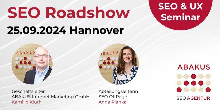 Nach der Roadshow ist vor der Roadshow: Nach der SEO Roadshow im Mai 2024 wird es in der zweiten Jahreshälfte einen weiteren Termin geben. Am 25. September 2024 wird in den Räumlichkeiten der ABAKUS Internet Marketing GmbH in Hannover erneut geballtes Wissen rund um das Thema Suchmaschinenoptimierung praxisnah vermittelt.
