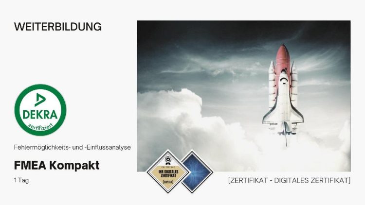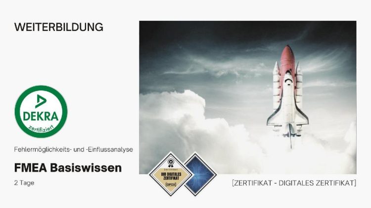 Das FMEA Basiswissen / FMEA Grundlagenseminar (2 Tage) bietet einen umfassenden Überblick über die Anwendungsbereiche und die Einbettung der FMEA Methode in Qualitätsstrategien. Erweiterte Arbeitsweisen sowie die Unterscheidung in System-, Konstruktions- und Prozess-FMEA werden dabei detailliert thematisiert. Wichtige Kernelemente des Seminars bilden dabei die VDA-konforme Anwendung der 7 Schritte der FMEA. Dieses Seminar richtet sich an Interessierte und Führungskräfte,…Continue reading FMEA Grundlagen | FMEA Basiswissen Schulung | Seminar (2 Tage) (Seminar | Stuttgart)