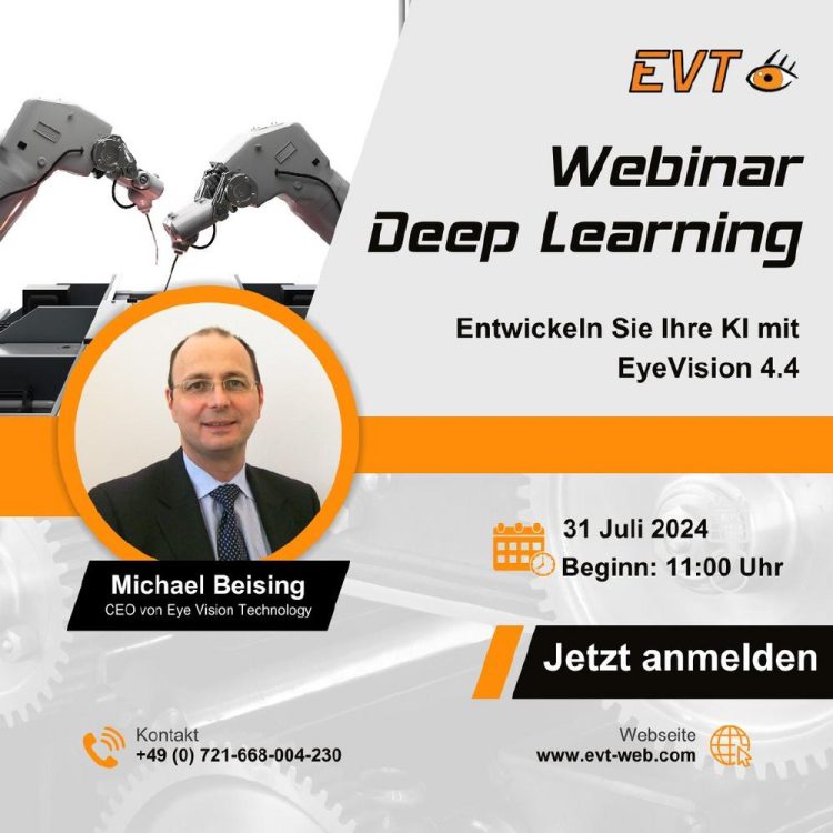Verpassen Sie nicht die Gelegenheit, mit Michael Beising, CEO von Eye Vision Technology, in die neuesten Entwicklungen einzutauchen, einschließlich Deep Learning, Transfer Learning und mehr! Termin: 31. Juli, Mittwoch Uhrzeit: 11 Uhr Plattform: ZOOM Was wird präsentiert? Umfangreiche Demonstrationen: Sehen Sie anhand von Echtzeit-Beispielen, wie EyeVision 4.4 Deep Learning funktioniert.Experteneinblicke: Erhalten Sie wertvolles Wissen über Trends und Techniken von Michael…Continue reading Erleben Sie KI-Methoden mit EyeVision 4.4 (Webinar | Online)