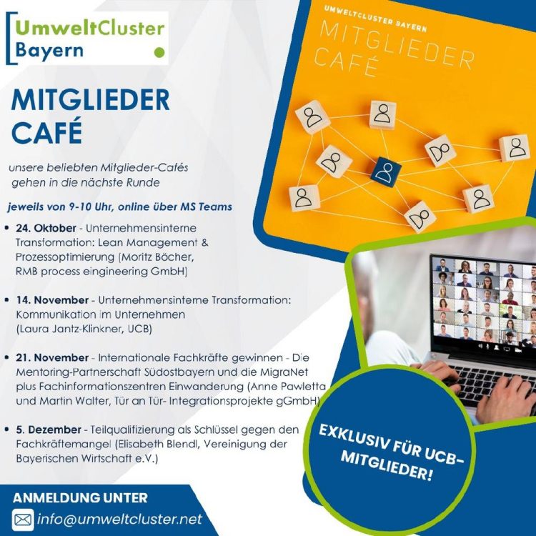 Fachkräftegewinnung und unternehmensinterne Transformationsprozesse – beides Themen die viele Unternehmen aktuell beschäftigen. Um seine Mitglieder bei diesen Herausforderungen zu unterstützen, möchte der Umweltcluster im Rahmen mehrerer Mitglieder-Cafés auf einzelne Aspekte dieser Themenfelder eingehen. Im Rahmen der Termine wird jeweils ein Impuls zu den Fokusthemen gegeben und der Bedarf für weiterführende Angebote abgeklärt. Daneben bietet sich…Continue reading Mitglieder-Café: Internationale Fachkräfte gewinnen – Die Mentoring-Partnerschaft Südostbayern (Webinar | Online)