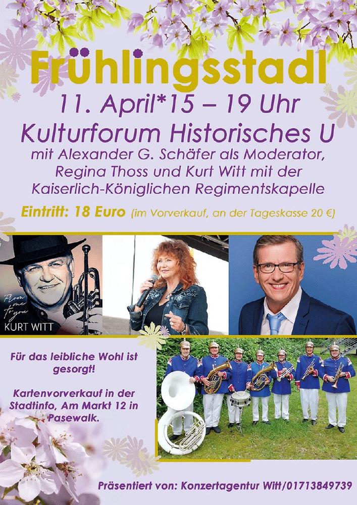 Frühlingsstadl mit Alexander G. Schäfer als Moderator, Regina Thoss & Kurt Witt mit der Kaiserlich-Königlichen Regimentskapelle Eintritt im Vorverkauf 18 Euro, an der Tageskasse 20 Euro (Karten im Vorverkauf in der Stadtinformation erhältlich) Das Tanzbein kann geschwungen werden. Eventdatum: Freitag, 11. April 2025 15:00 – 19:00 Eventort: Pasewalk Firmenkontakt und Herausgeber der Eventbeschreibung: Stadt PasewalkAm…Continue reading Frühlingsstadl (Unterhaltung / Freizeit | Pasewalk)