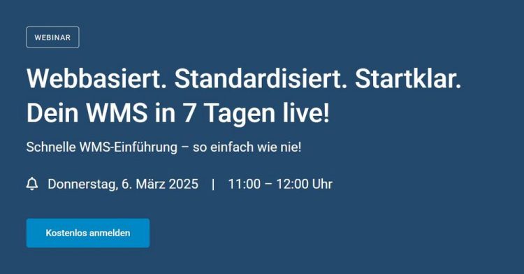 Webinar: Webbasiert. Standardisiert. Startklar. Dein WMS in 7 Tagen live!Schnelle WMS-Einführung – so einfach wie nie!Donnerstag, 6. März 2025 | 11:00 – 12:00 Uhr→ Hier kostenlos anmelden Viele Unternehmen stehen vor der Herausforderung, ihre Lagerverwaltung effizienter zu gestalten, ohne hohe Kosten oder lange Implementierungszeiten in Kauf nehmen zu müssen. Doch ist die Einführung eines Warehouse Management Systems…Continue reading Webbasiert. Standardisiert. Startklar. Dein WMS in 7 Tagen live! (Webinar | Online)