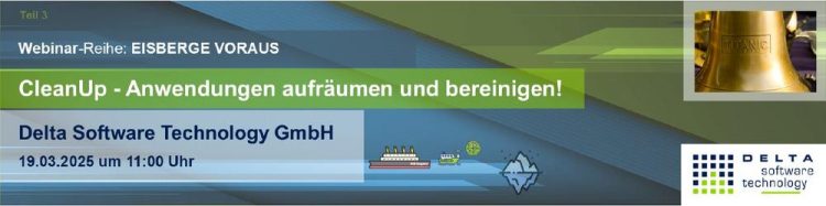 Im dritten Teil steht das Aufräumen und Bereinigen von Anwendungen im Fokus. Eisberge sollte man besser umschiffen, das hat uns die Titanic bereits vor über 100 Jahren gelehrt. Auch in der Anwendungsmodernisierung gibt es Eisberge. In der dritten Folge des Webinars „Eisberge voraus“ zeigen wir Ihnen wie Sie Ihre Anwendungen mit uns sicher aufräumen und bereinigen können. Gehen Sie am…Continue reading Teil 3: „CleanUp – Anwendungen aufräumen und bereinigen!“ am 19.03.2025 (Webinar | Online)