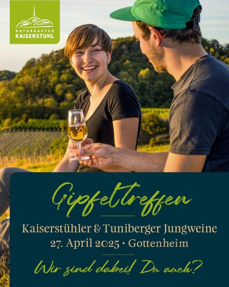 Gipfel-Treffen der Jungweine in Gottenheim!Am 27. April 2025 erwartet euch ein Weinerlebnis der besonderen Art: Mehr als 60 Jungweine aus Kaiserstuhl & Tuniberg stehen am Pavillon beim Wasserhochbehälter zur Verkostung bereit. Ausschank ab 12:00 Uhr durch die Naturgarten Kaiserstuhl GmbH & Tourist-Infos – mit dabei: Bereichsweinprinzessin Pia Probst!Spezialitäten von den Gottenheimer LandfrauenWandern & Wein genießen…Continue reading Gipfeltreffen Kaiserstühler und Tuniberger Jungweine (Unterhaltung / Freizeit | Gottenheim)