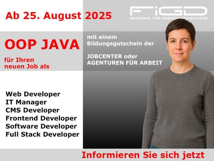 Die objektorientierte Programmierung mit Java ist ein gefragtes Fundament moderner Softwareentwicklung – sei es für komplexe Businesslösungen, mobile Anwendungen oder Webanwendungen mit Benutzeroberfläche. Die FiGD Akademie bietet mit der Weiterbildung „OOP Java“ ab dem 25. August 2025 ein fundiertes Qualifizierungsangebot für alle, die einen beruflichen Einstieg oder Umstieg in die IT-Welt anstreben. Erste Informationen zur…Continue reading Jetzt OOP Java lernen – objektorientiert, praxisnah, zukunftsfest (Schulung | Berlin)
