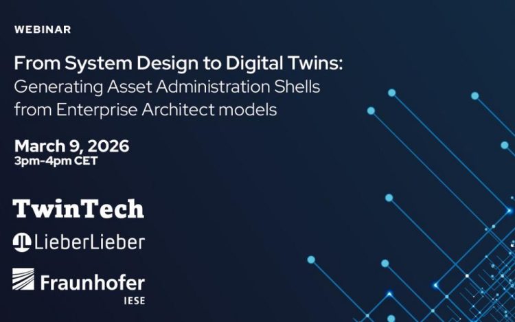 Together with our partners TwinTech and Fraunhofer IESE, we cordially invite you to attend the webinar ‘From System Design to Digital Twins: Generating Asset Administration Shells from Enterprise Architect models’ on Monday, 9 March 2026 (3:00 p.m. – 4:00 p.m.).