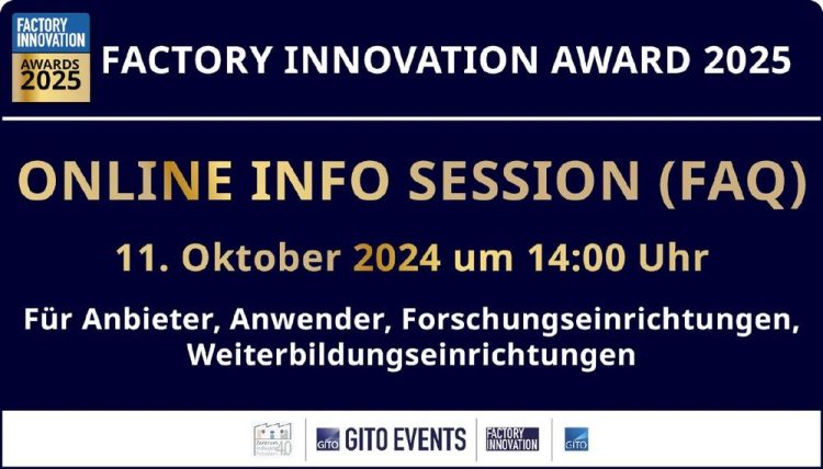 Sind Sie Anbieter, Anwender, Forschungs- oder Weiterbildungseinrichtung? Dann informieren Sie sich diesen Freitag über Teilnahmemöglichkeiten beim Factory Innovation Award 2025. Worauf die Jury achtet, Kategorien 2025, Teilnahmeberechtigte, Deadlines, Hannover Messe 2025, der Weg zum Ziel, was Sie beachten sollten, etc. Melden Sie sich jetzt hier an. Eventdatum: Freitag, 11. Oktober 2024 14:00 – 14:30 Eventort:…Continue reading Online Info Session & FAQ zum Factory Innovation Award 2025 (Webinar | Online)