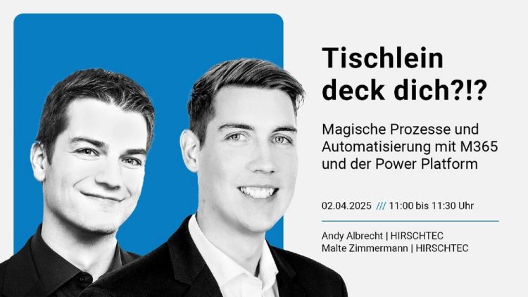 Bye, bye „Copy & Paste“! Sie wünschen sich spürbare Entlastung und möchten weniger Inhalte von links nach rechts schieben? Sie möchten lästige Routineaufgaben eliminieren und Prozesse, Abfragen o. Ä. effizienter gestalten? Dafür müssen Sie weder Zauberer noch IT-Crack sein. Andy Albrecht und Malte Zimmermann zeigen Ihnen, wie Sie mit der Power Platform von Microsoft 365…Continue reading „Tischlein deck dich?!?“ Magische Prozesse und Automatisierung mit M365 und der Power Platform (Webinar | Online)