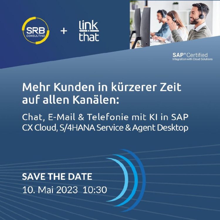 Save the Date: am 10. Mai um 10.30 Uhr startet das nächste Webinar von LinkThat. Dabei zeigen wir gemeinsam mit SRB Consulting wie effizient Kundenservice auf allen Kanälen sein kann. Mehr Kunden in kürzerer Zeit auf allen Kanälen: Chat, E-Mail & Telefonie mit KI in SAP CX Cloud,S/4HANA Service & Agent Desktop Webinar: Mittwoch,…Continue reading Mehr Kunden in kürzerer Zeit auf allen Kanälen: Chat, E-Mail & Telefonie mit KI (Webinar | Online)