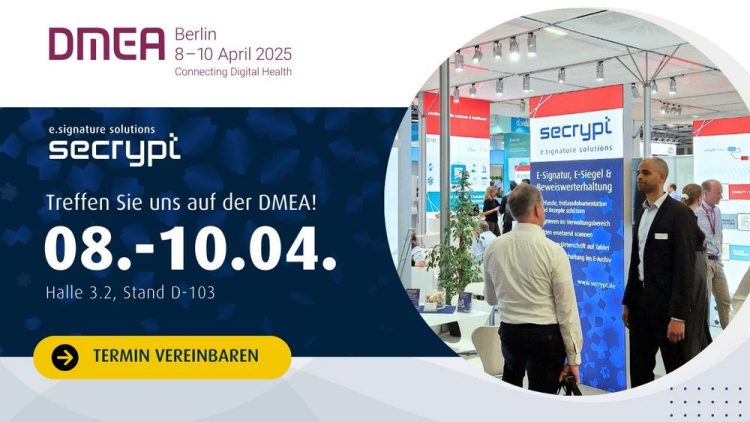 Wir sind Teil der DMEA 2025! ✨ Besuchen Sie uns vom 8. bis 10. April in Halle 3.2, Stand D-103 und tauschen Sie sich mit uns über innovative E-Signatur-Lösungen für das Gesundheitswesen aus. Unsere Schwerpunkte: ✅ Befunde, Entlassdokumentation und Rezepte schützen: Sorgen Sie mit unseren digiSeal®-Lösungen für die Integrität und Vertraulichkeit sensibler medizinischer Dokumente. ✅…Continue reading secrypt auf der DMEA 2025 – Jetzt Messetermin vereinbaren (Messe | Berlin)