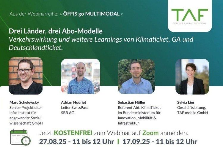 Seit einiger Zeit gibt es sie, die nationalen Öffis-Abos, nicht nur in Deutschland, auch in Österreich und in der Schweiz. Welche Besonderheiten innerhalb der Angebote in Österreich, der Schweiz und in Deutschland gibt es? Welche verkehrlichen Effekte können beim KlimaTicket, Generalabonnement und dem Deutschlandticket aktuell abgelesen werden und was können wir voneinander lernen, für eine…Continue reading Wie erfolgreich sind nationale Öffi-Abos? – Erkenntnisse zur verkehrlichen Wirkung und Akzeptanz (Webinar | Online)