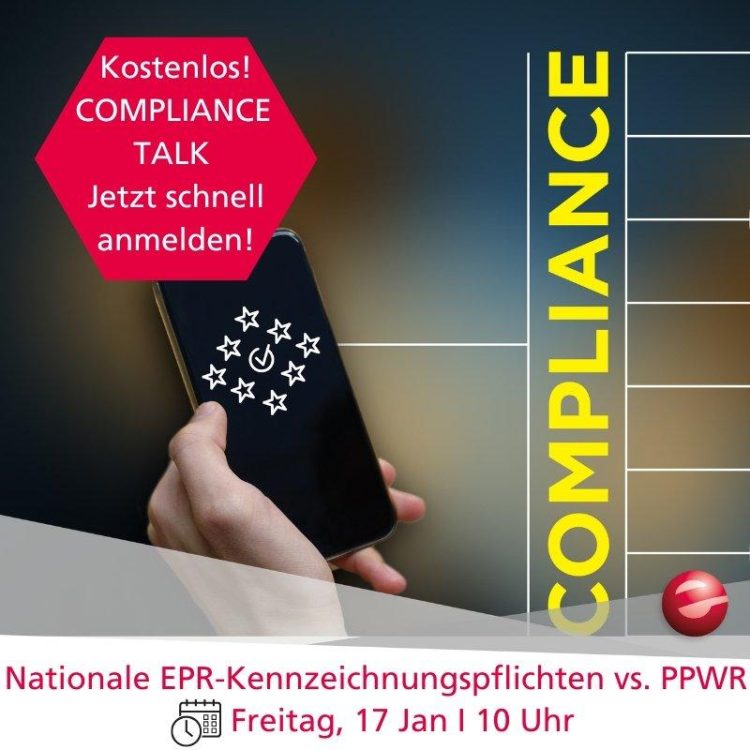Freitag, 17. Januar – 10:00 – 11:00 Uhr. CET – Kostenlosen Compliance Talk im Januar: EU-Verpackungsverordnung vs. Nationale EPR-Kennzeichnungspflichten – Was ist, was wird, was geht? Erhalten Sie klare Einblicke und erfahren Sie, welche Kennzeichnungspflichten aktuell gelten und was durch die neue EU-Verpackungsverordnung auf Sie zukommt. Lernen Sie, wie sich Unternehmen jetzt optimal auf die…Continue reading Kostenloser Compliance Talk im Januar: Nationale EPR-Kennzeichnungspflichten vs. PPWR (Webinar | Online)