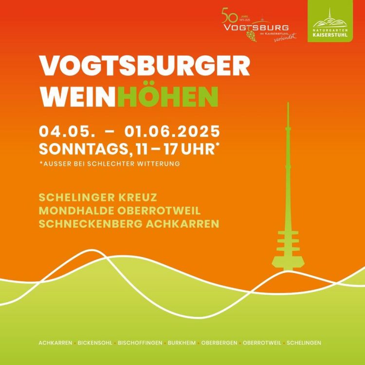REGIONALE WEINE GENIESSEN AN DEN SCHÖNSTEN AUSSICHTSPUNKTEN RUND UM VOGTSBURG, DAS IST HOCHGENUSS IM KAISERSTUHL Aussichtsreiche Wege, herrliche Panoramen und Weingenuss der Vogtsburger Winzer – „Herzlich willkommen“ auf den Vogtsburger Weinhöhen. Der Weinausschank öffnet jeden Sonntag vom 04. Mai bis 01. Juni 2025, in der Zeit von 11 bis 17 Uhr. Bei schlechter Witterung behalten…Continue reading Vogtsburger Weinhöhen am Schelinger Kreuz (Unterhaltung / Freizeit | Vogtsburg im Kaiserstuhl)