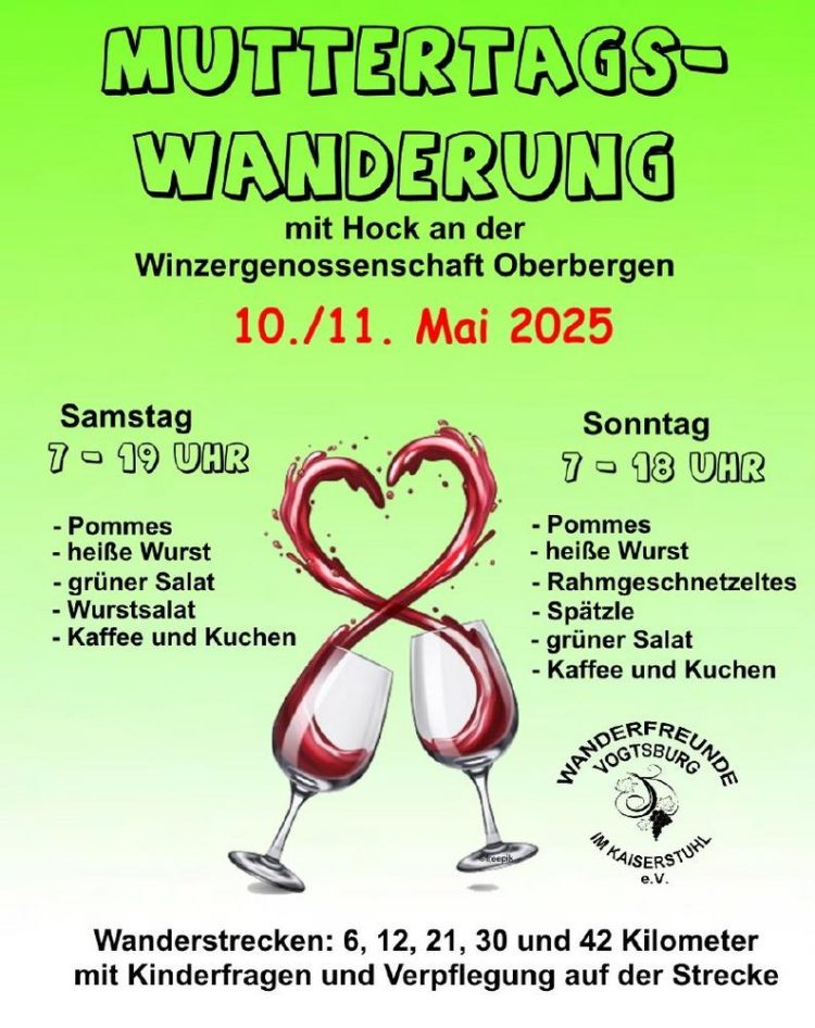 Samstag: 7 – 19 UhrSonntag: 7 – 18 Uhrmit verschiedenen Wanderstrecken und Verpflegung Es erwartet Sie Kulinarik rund um Kaffee, Kuchen, Pommes, Wurst, Salat.Am Sonntag: auch Rahmgeschnetzeltes mit Spätzle und Salatund natürlich viele Wein- und Sektspezialitäten. Eventdatum: 10.05.25 – 11.05.25 Eventort: Vogtsburg im Kaiserstuhl Firmenkontakt und Herausgeber der Eventbeschreibung: Winzergenossenschaft Oberbergen eGBadbergstraße 279235 Vogtsburg- OberbergenTelefon:…Continue reading Muttertags-Wanderung der Wanderfreunde Vogtsburg (Unterhaltung / Freizeit | Vogtsburg im Kaiserstuhl)