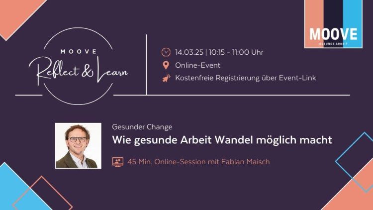 Veränderungen in der Unternehmenslandschaft sind unvermeidlich – aber auch herausfordernd. Was entscheidet darüber, ob Transformation gelingt oder ins Stocken gerät? Ein oft unterschätzter Erfolgsfaktor sind die Menschen, die den Wandel gestalten. Fabian Maisch (MOOVE GmbH) klärt auf, warum gesunde Arbeit der Schlüssel für nachhaltige Veränderungsprozesse ist und wie ihr diesen Faktor gezielt nutzen könnt, um…Continue reading Gesunder Change: Wie gesunde Arbeit Wandel möglich macht (Webinar | Online)