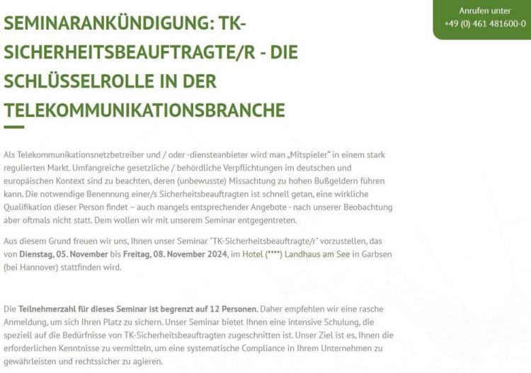 Als Telekommunikationsnetzbetreiber und / oder -diensteanbieter wird man „Mitspieler“ in einem stark regulierten Markt. Umfangreiche gesetzliche / behördliche Verpflichtungen im deutschen und europäischen Kontext sind zu beachten, deren (unbewusste) Missachtung zu hohen Bußgeldern führen kann. Die notwendige Benennung einer/s Sicherheitsbeauftragten ist schnell getan, eine wirkliche Qualifikation dieser Person findet – auch mangels entsprechender Angebote –…Continue reading Seminar: TK-Sicherheitsbeauftragte/r (Seminar | Garbsen)