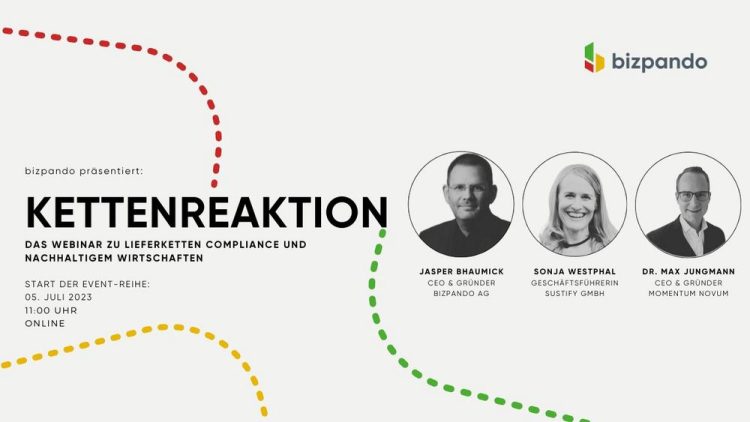 Am 5. Juli startet „Kettenreaktion“, die neue Eventreihe von bizpando zu allem rund um Lieferketten Compliance und nachhaltigem Wirtschaften. In unserer ersten Ausgabe freuen wir uns auf die Gäste Sonja Westphal, Geschäftsführerin der Sustify GmbH und Dr. Max Jungmann, CEO von Momentum Novum. Mit unserem CEO Jasper Bhaumick widmen sie sich der Frage: Wie stoßen…Continue reading Kettenreaktion: Das Webinar zu Lieferketten Compliance und nachhaltigem Wirtschaften (Webinar | Online)