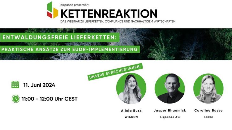 Am 11. Juni geht die Kettenreaktion in die nächste Runde! Thema: Entwaldungsfreie Lieferketten: Praktische Ansätze zur EUDR-Implementierung Datum: 11. Juni Uhrzeit: 11:00 – 12:00 Uhr Sprecher:innen: Alicia Buss, ESG Compliance Consultant bei WIACON, Caroline Busse, Co-Founder und CEO von nadar, und Jasper Bhaumick, CEO der bizpando AG, Moderation: Sarah Sellner In der vierten Ausgabe unserer Webinarreihe…Continue reading Webinar: Entwaldungsfreie Lieferketten – Praktische Ansätze zur EUDR-Implementierung (Webinar | Online)