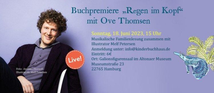 Buchpremiere mit Autor Ove Thomsen und Illustrator Melf Petersen Ove Thomsen, selbsternannte nordfriesische Frohnatur, kommt ins Kinderbuchhaus. Bereits als Sänger und Songschreiber hat er sich einen Namen gemacht. Mit „Regen im Kopf“ (plattdeutsch: „Regen in’n Kopp“) veröffentlicht der Wahlhamburger sein erstes Kinderbuch, mit dem er einen Beitrag zum Erhalt seiner Muttersprache leisten möchte. Illustriert hat…Continue reading Buchpremiere „Regen im Kopf“ / „Regen in’n Kopp“ – Familienlesung mit Musik und ein wenig Platt (Unterhaltung / Freizeit | Hamburg)