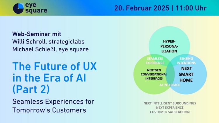 Auf vielfachen Wunsch präsentieren wir den zweiten Teil unseres Webinars vom Oktober 2024. Zum Thema „The Future of UX in the Era of AI (Part 2)“ sprechen Willi Schroll, strategiclabs und Michael Schießl, eye square. In dem kostenlosen Web-Seminar erfahren Sie mehr über folgende Zukunftsthemen: Hyper-Personalisierung Entdecken Sie, wie KI-gesteuerte Erkenntnisse helfen können, maßgeschneiderte Omnichannel-Erlebnisse…Continue reading The Future of UX in the Era of AI (Part 2): Seamless Experiences for Tomorrow’s Customers (Webinar | Online)