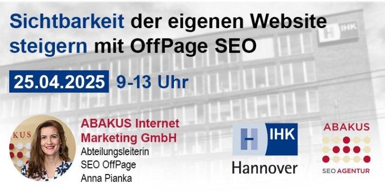 Am 25. April 2025 lädt die Industrie- und Handelskammer (IHK) Hannover zu einem praxisorientierten Halbtagesseminar ein, das Websitebetreibern und Online-Marketing-Professionals einen entscheidenden Einblick in die Welt der Offpage-Suchmaschinenoptimierung (OffPage SEO) ermöglicht. Die Referentin Anna Pianka, Leiterin des SEO OffPage Teams von ABAKUS Internet Marketing, teilt ihre Expertise in Linkbewertung und strategischem Linkaufbau. In Seminar „Sichtbarkeit…Continue reading Sichtbarkeit der eigenen Website steigern mit OffPage SEO (Seminar | Hannover)