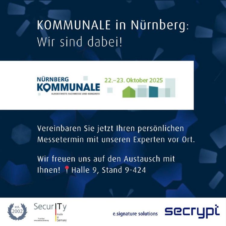 Am 22. und 23. Oktober 2025 öffnet die KOMMUNALE in Nürnberg ihre Tore – Deutschlands größte Fachmesse für Kommunalbedarf und zentraler Treffpunkt für Entscheiderinnen und Entscheider aus Städten und Gemeinden. Auch die Signaturexperten von secrypt sind als Aussteller vor Ort und zeigen, wie Kommunen mit elektronischen Signaturen und Siegeln ihre Verwaltungsprozesse effizienter, rechtssicher und zukunftssicher gestalten können. …Continue reading Signaturexperten von secrypt auf der KOMMUNALE in Nürnberg (Messe | Nürnberg)