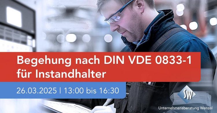 Normgerechte Begehungen nach DIN VDE 0833-1 für höchste Sicherheit und Verlässlichkeit Stärken Sie Ihre Kompetenz mit unserer spezialisierten Halbtagesschulung zur Begehung nach DIN VDE 0833-1 für Instandhalter. Erfahren Sie, was bei einer Begehung zu tun ist und welche Anforderungen die DIN VDE 0833-1 stellt. Durch unser Fachwissen lernen Sie die Instandhaltungsprozesse kennen und tragen maßgeblich zum…Continue reading Normgerechte Begehungen nach DIN VDE 0833-1 (Schulung | Online)
