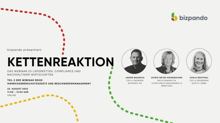Am 5. Juli startet „Kettenreaktion“, die neue Eventreihe von bizpando zu allem rund um Lieferketten Compliance und nachhaltigem Wirtschaften. In unserer ersten Ausgabe freuen wir uns auf die Gäste Sonja Westphal, Geschäftsführerin der Sustify GmbH und Dr. Max Jungmann, CEO von Momentum Novum. Mit unserem CEO Jasper Bhaumick widmen sie sich der Frage: Wie stoßen…Continue reading Kettenreaktion: Das Webinar zu Lieferketten Compliance und nachhaltigem Wirtschaften (Webinar | Online)
