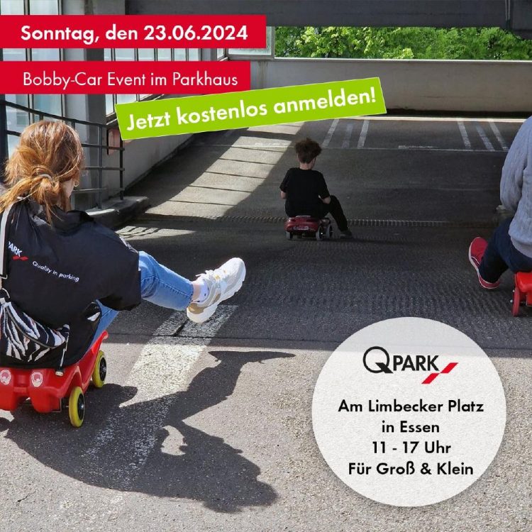 Schonmal im Parkhaus Bobby-Car gefahren? Bereit für den Adrenalinkick auf vier Rädern? Q-Park organisiert am Sonntag, den 23.06.2024 in der Zeit von 11 – 17 Uhr ein Bobby-Car Event im Parkhaus „Am Limbecker Platz“ in Essen. Treten Sie kostenlos im Bobbycar Fun Rennen gegen die Profis des Bobby-Car-Sport-Verbands sowie allen anderen Interessierten an und kämpfen Sie um den…Continue reading Bobby-Car Event für Klein & Groß im Q-Park Parkhaus (Unterhaltung / Freizeit | Essen)