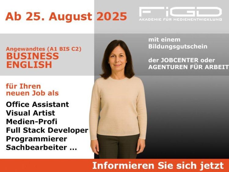 Ob im Medienbüro, der IT-Branche oder im internationalen Projektmanagement – fundierte Englischkenntnisse sind heute Schlüsselqualifikation. Mit der beruflichen Weiterbildung „Business English (A1 bis C2)“ der FiGD Akademie erwerben Sie praxisnahe Sprachkompetenz – live, interaktiv und bequem online. Der Kurs startet am 24. November 2025 und ist vollständig förderbar über den Bildungsgutschein. Der Unterricht findet werktags…Continue reading Mit Weiterbildung ins internationale Berufsleben – Englischkompetenz aus dem Homeoffice (Schulung | Berlin)